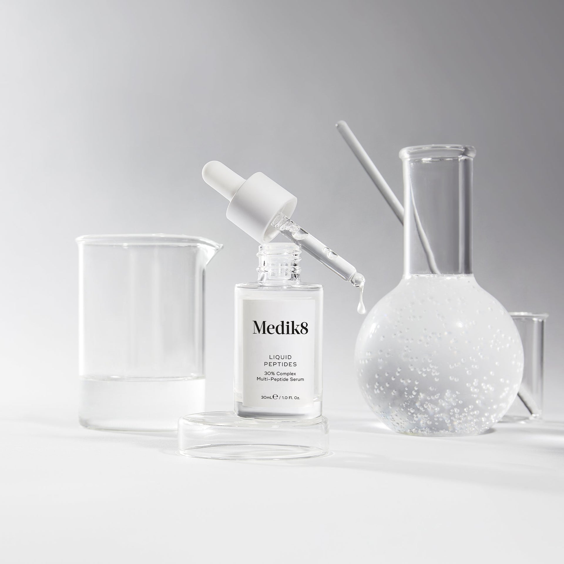 Recognising that different peptide combinations pose endless age-defying abilities (and do so much more for the skin than simply boost collagen production), Medik8 has taken traditional peptide technology to the next level with Liquid Peptides. Formulated with 10 distinct peptides (a collection of our favourites), the crystal-clear serum uses a pioneering drone-targeted delivery system to ensure that each potent peptide can dive deep into the skin - to where it’s needed most - to deliver its specific youth-boosting action. Working across multiple pathways, our 10 chosen peptides deliver maximum visible results on the look of fine lines, wrinkles and skin volume. This cell-signalling peptide serum ultimately helps to both slow and prevent the formation of expression lines and deep-set wrinkles. Its 30% peptide blend also works to instantly hydrate the skin, making this multifaceted peptide cocktail the ideal formula for ageing, dry and dehydrated skin types.