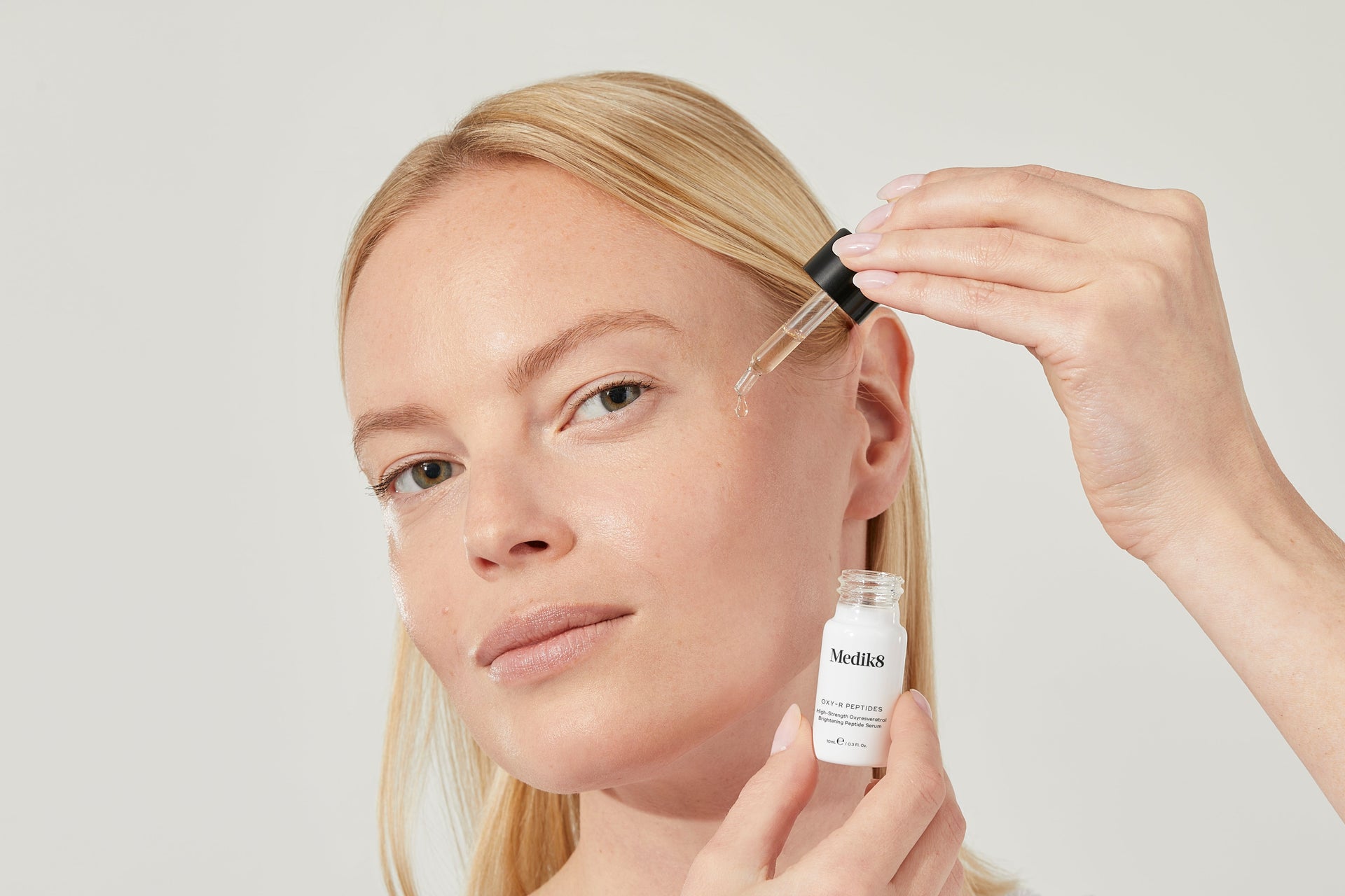 So, we have our final formula: our star ingredient Oxy-R, two brightening twin-peptides and hyaluronic acid - all combined into a hydrating cocktail that’s ready to target an uneven complexion. Let’s put it to the test.